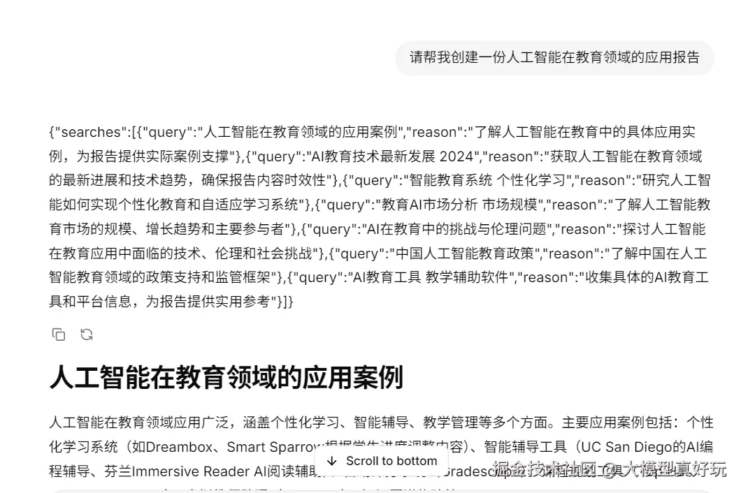 ,点击确认后会跳转到对话页面。在对话页面中输入测试问题:请帮我创建一份人工智能在教育领域的应用报告 -