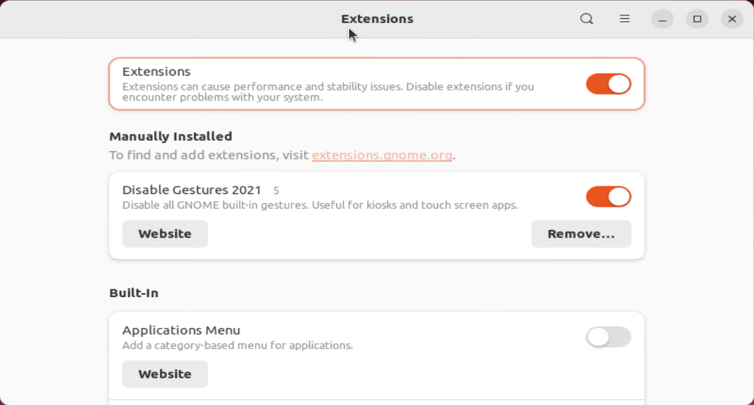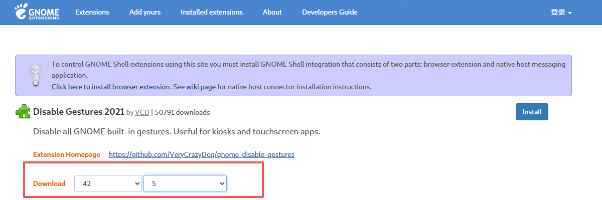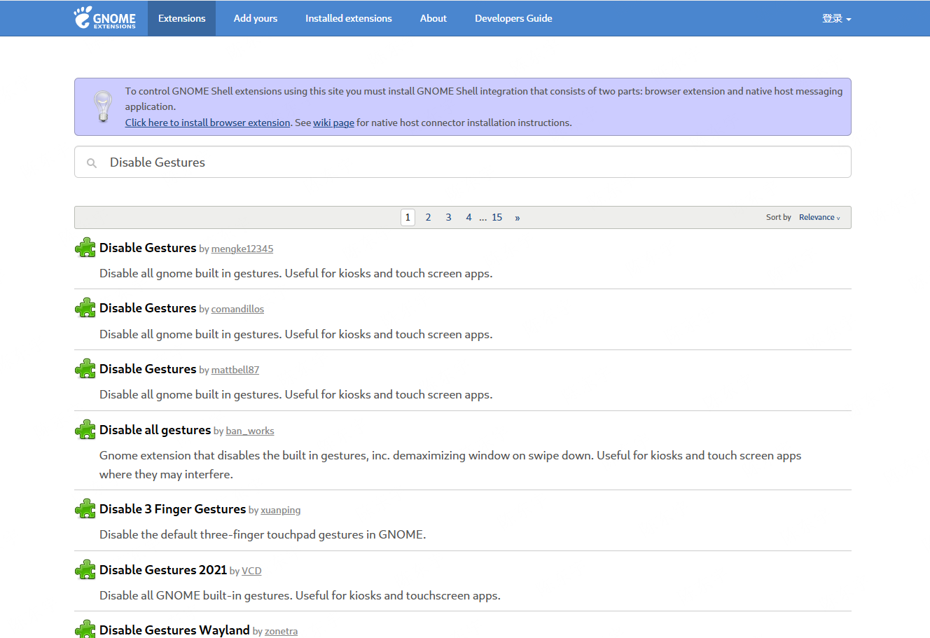 打开gnome插件官网https://extensions.gnome.org/,搜索Disable Gestures