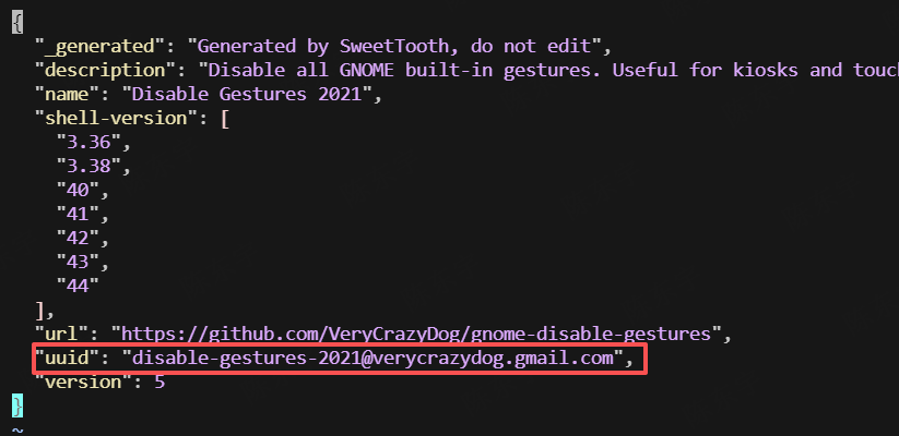 解压压缩包得到两个文件extension.js 和metadata.json ,打开metadata.json ,找到uuid