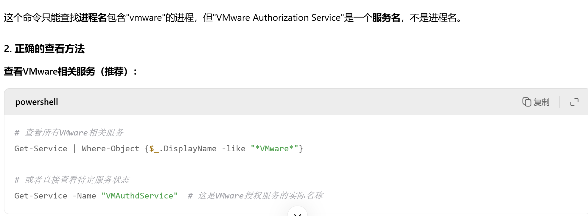 PS C:\Users\11400> get-process | where-Object {$_.ProcessName -like "*vmware" }