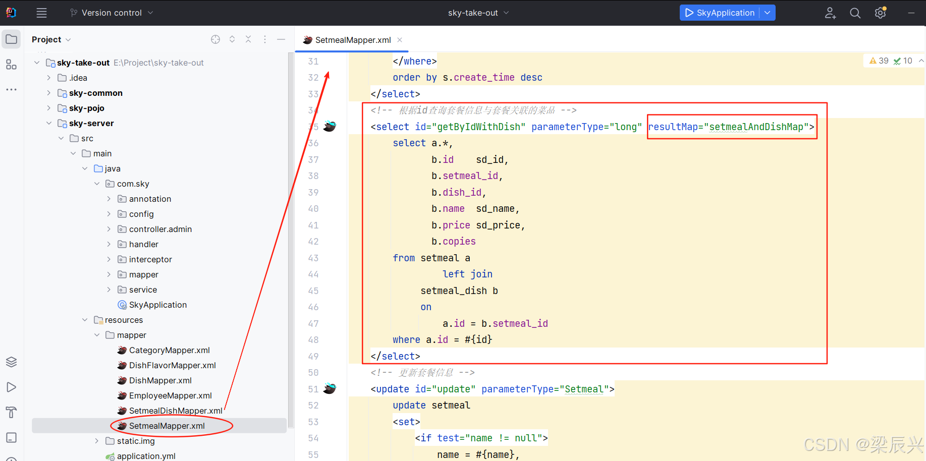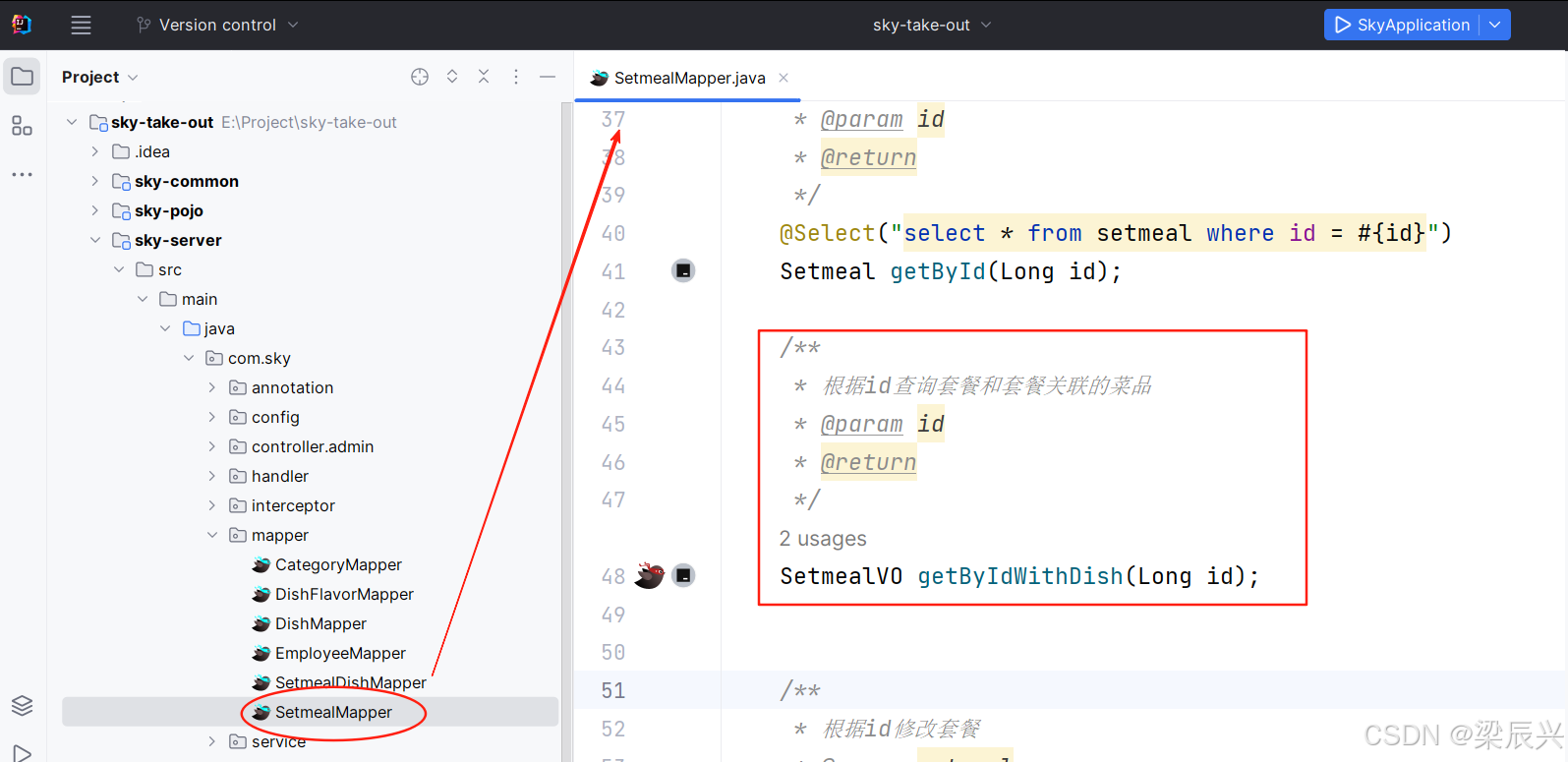 要回显套餐信息,首先需要从数据库中查询套餐的完整数据------不仅包括套餐本身的基本信息(如名称、分类ID、状态等),还包括该套餐关联的所有菜品(如菜品ID、名称、数量等)。因此,我们在SetmealMapper