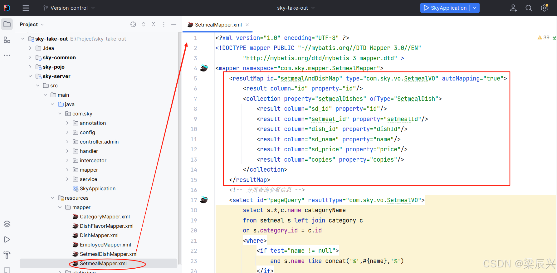 (套餐-菜品关联表),一次性查询出套餐的基本信息和所有关联的菜品信息,再通过前面定义的resultMap