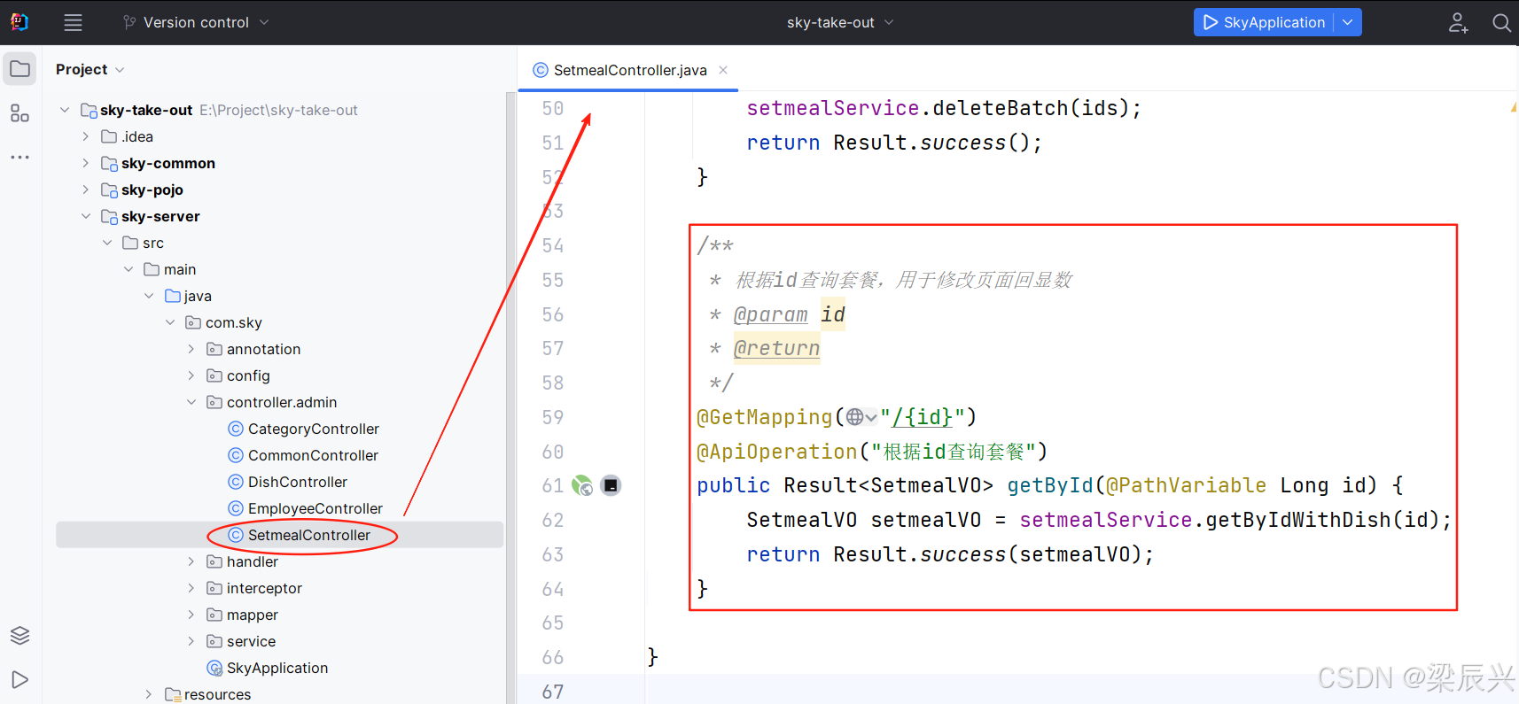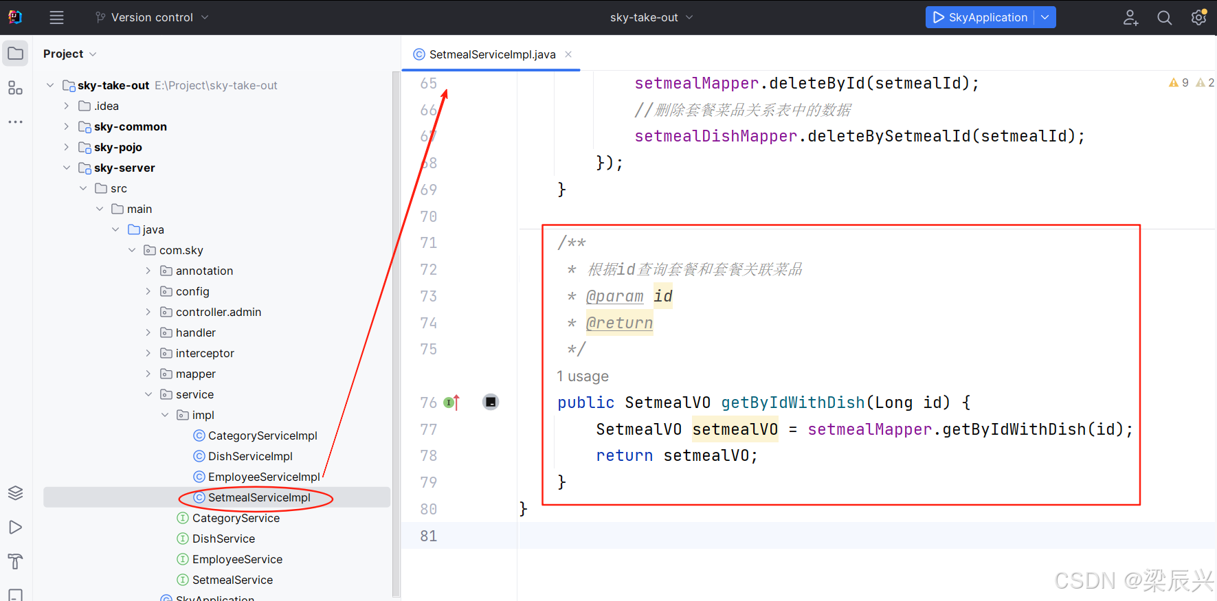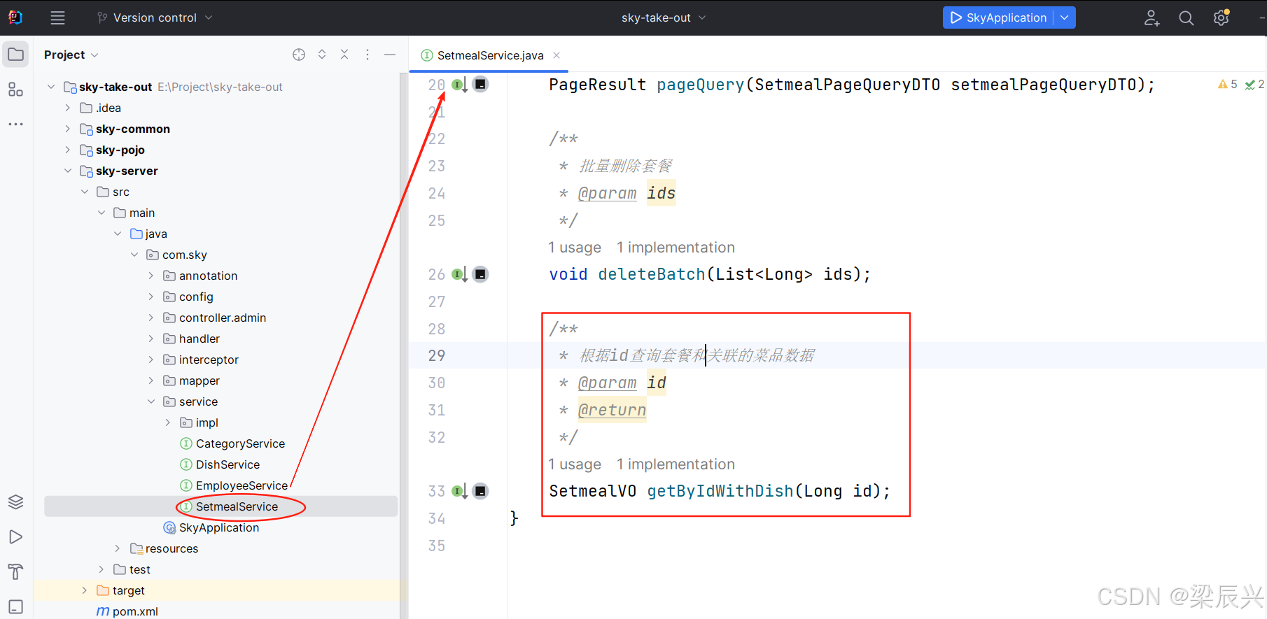 Service层作为业务逻辑的中间层,需要定义一个接口方法,供Controller调用,获取包含关联菜品的套餐信息。