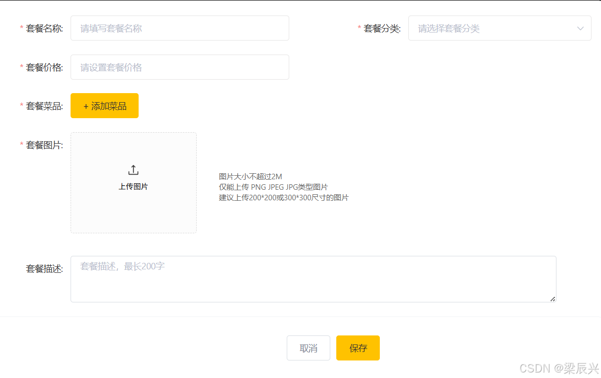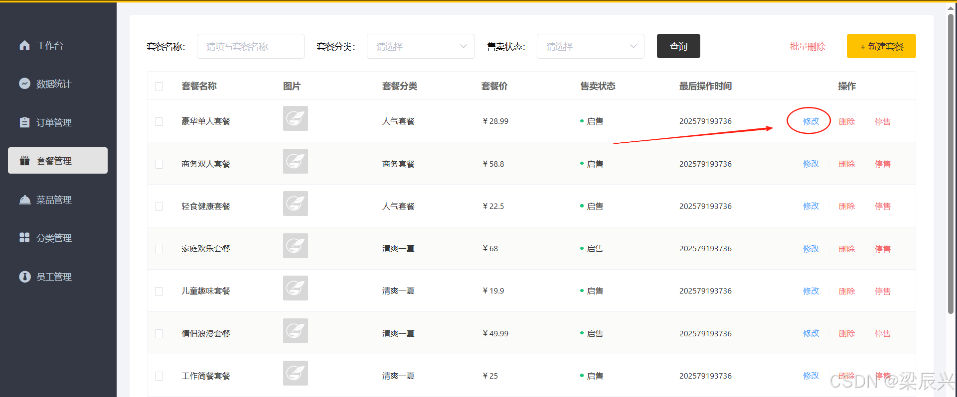 在套餐管理中,当用户点击"修改"按钮时,系统需要将该套餐的现有信息(包括套餐基本信息和包含的菜品)自动填充到修改框中,方便用户在原有信息基础上编辑。这个"自动填充"的过程就是"回显"。下面我们一步步实现套餐信息的回显功能。