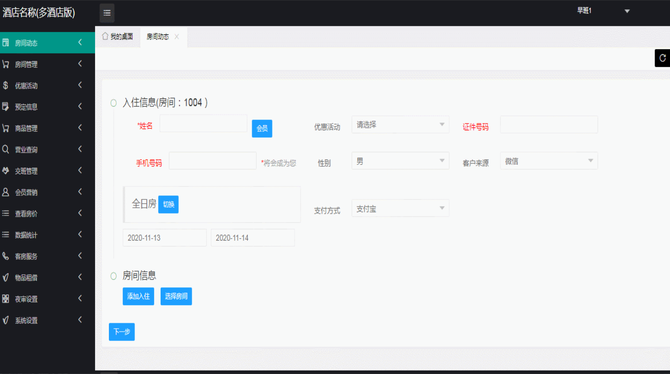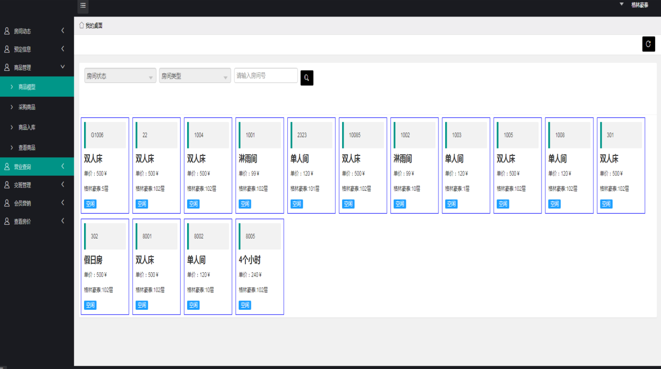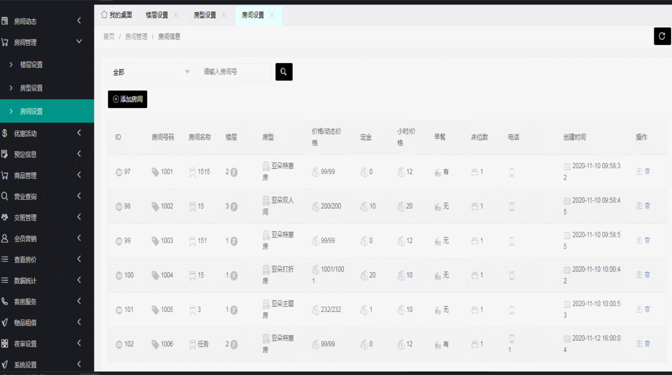 房间动态、房间管理、优惠活动、预定信息、商品管理、营业查询、交班管理