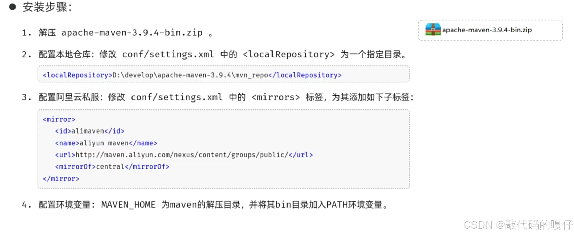 打包 :Maven中的打包是将项目的源代码和资源文件进行编译、处理后,生成可分发的文件格式的过程。Maven支持多种打包格式,如JAR(Java Archive)、WAR(Web Application Archive)等。打包过程由Maven的生命周期管理,通过执行特定的Maven命令(如