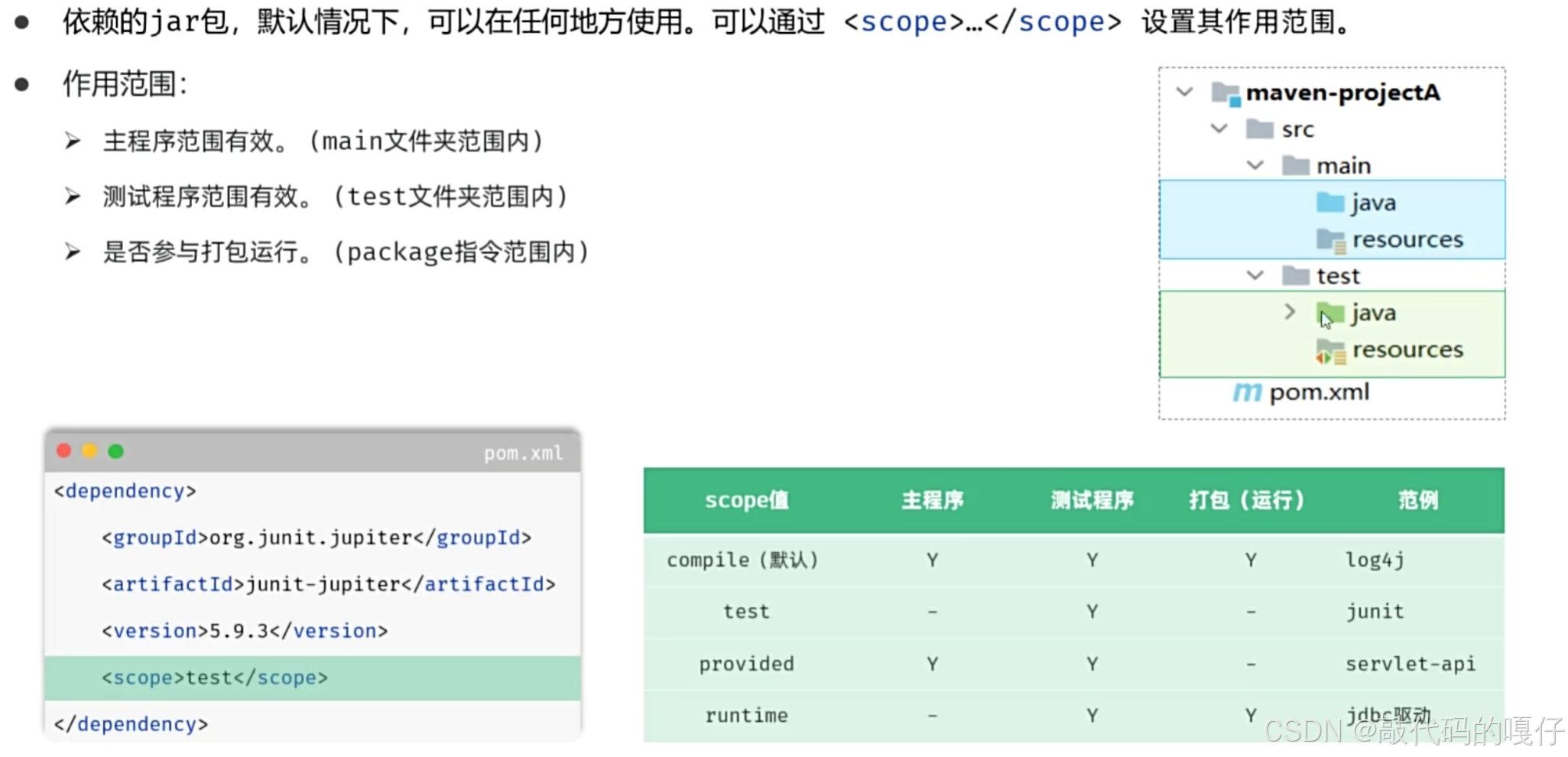 加入<scope>test</scope>后在main编写测试代码会报错,这样就进行了规范限制