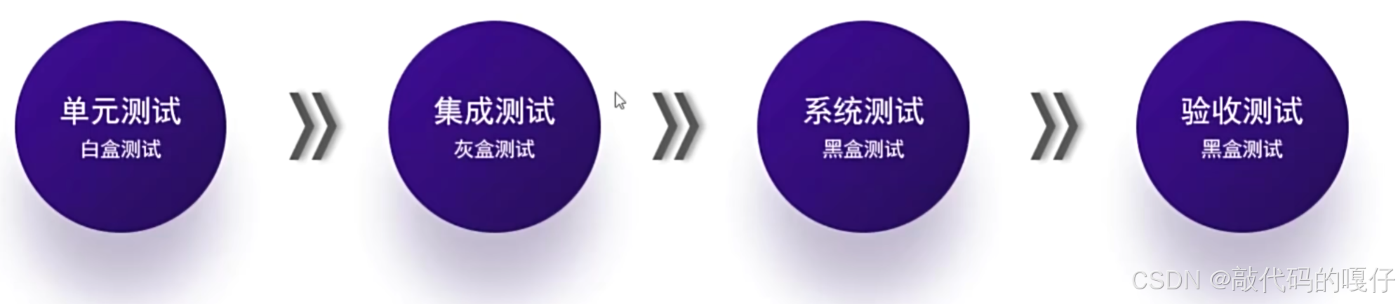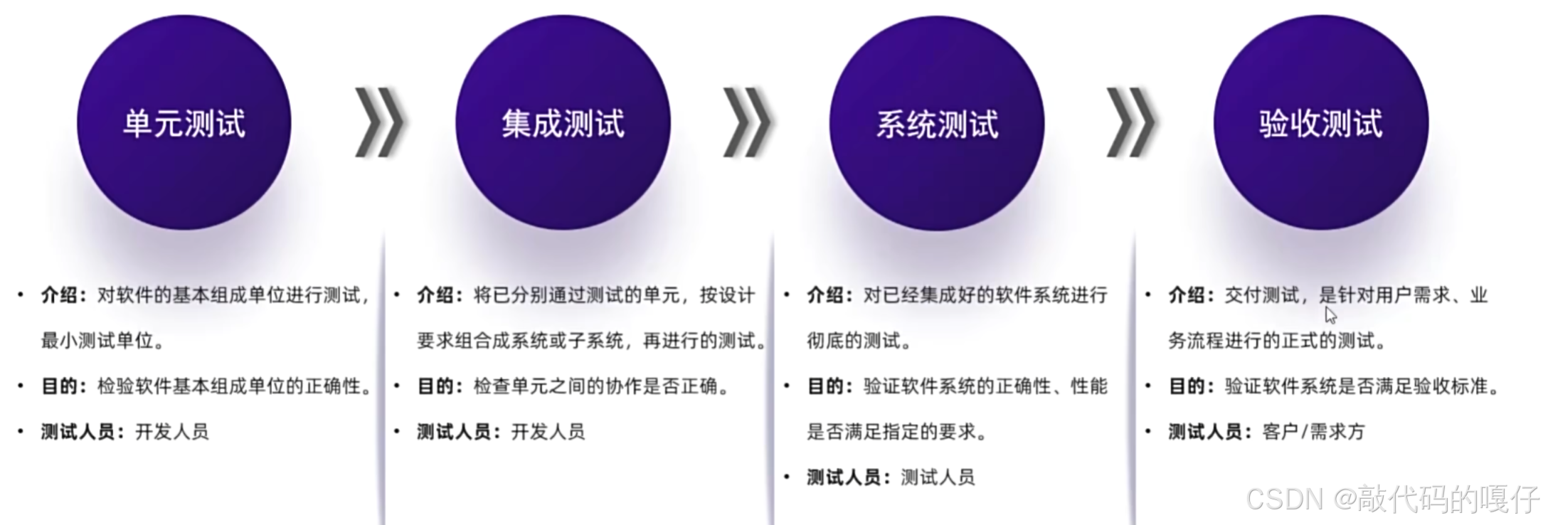 **阶段划分:**单元测试、集成测试、系统测试、验收测试