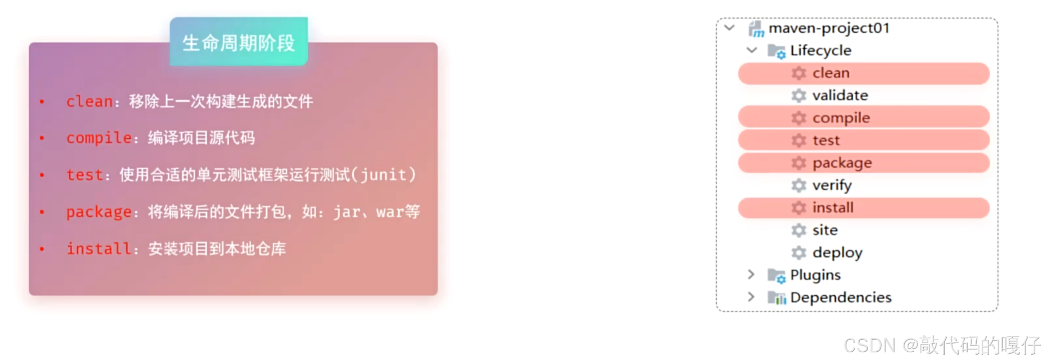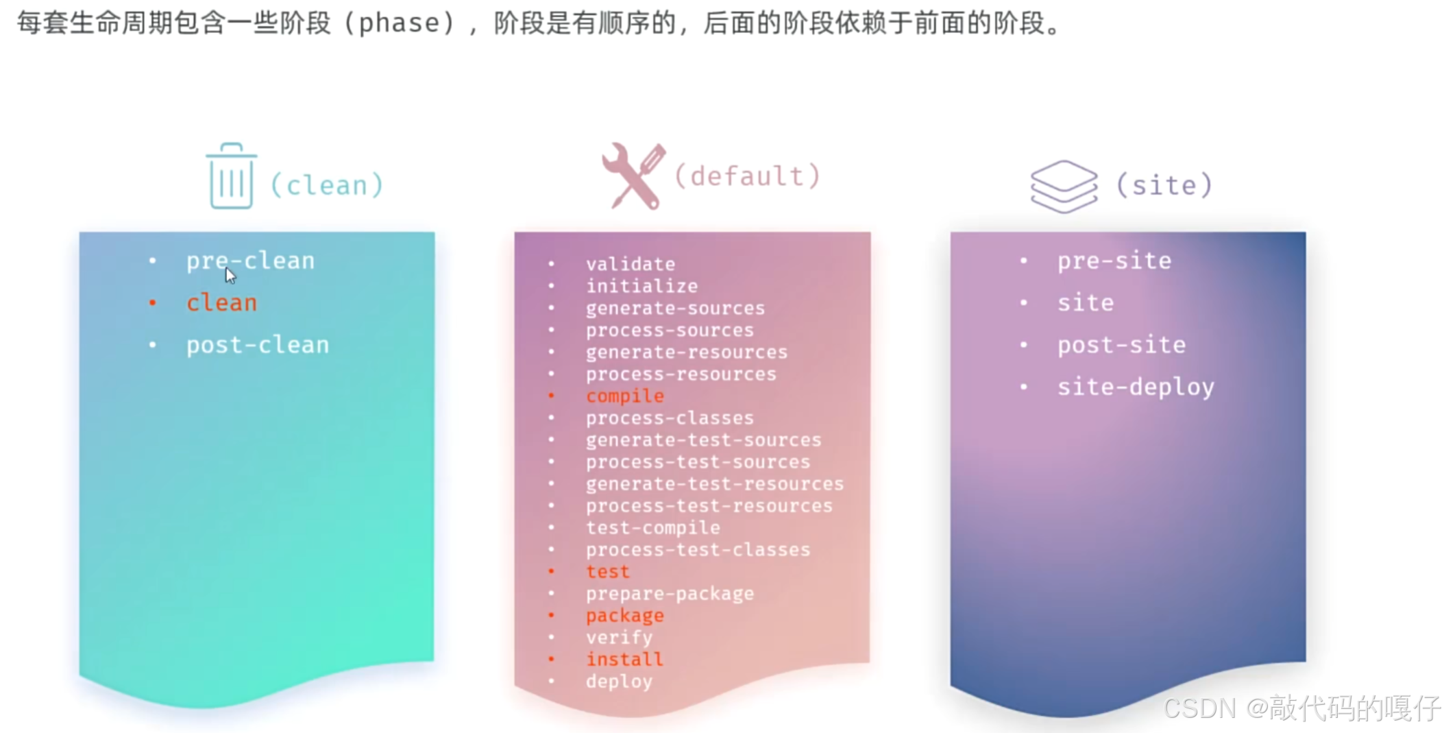 **default:**核心工作,如:编译,测试,打包,安装,部署等