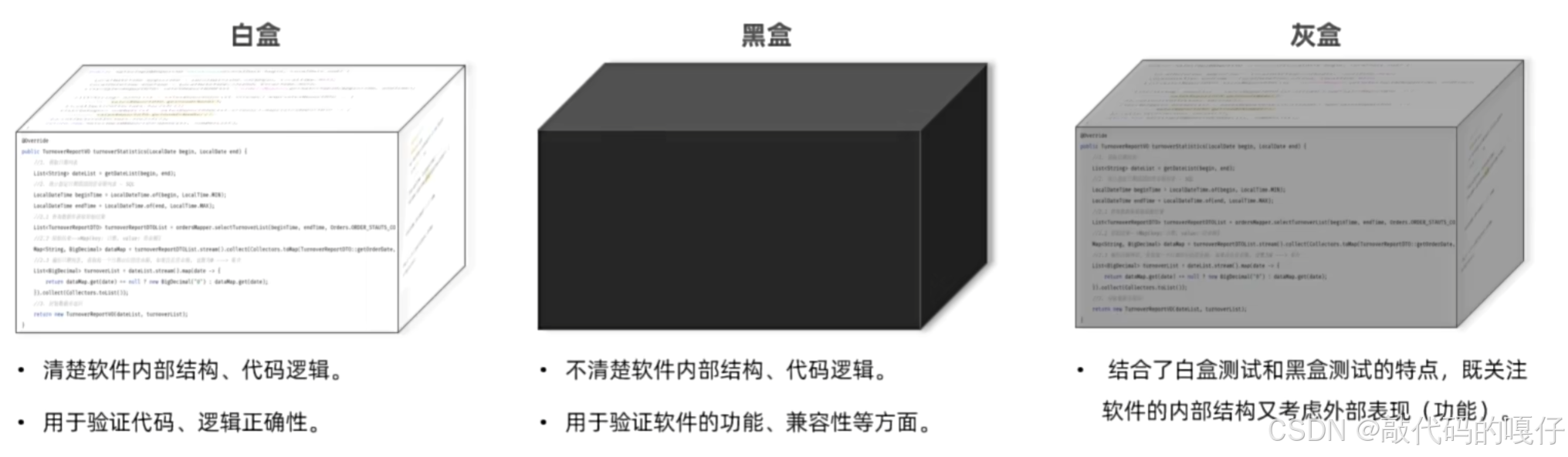 **测试方法:**白盒测试、黑盒测试、灰盒测试