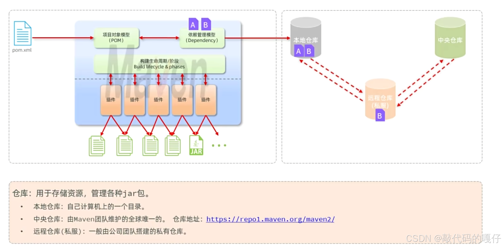 JAR包 :JAR是Java Archive的缩写,它是一种基于ZIP格式的文件,用于将多个Java类文件、相关的资源文件(如配置文件、图片等)和元数据(如清单文件)组合成一个单一的文件。JAR包可以包含一个完整的Java应用程序、库或模块,方便在不同的项目中复用。在Maven项目中,JAR包通常是打包的默认输出格式,通过执行