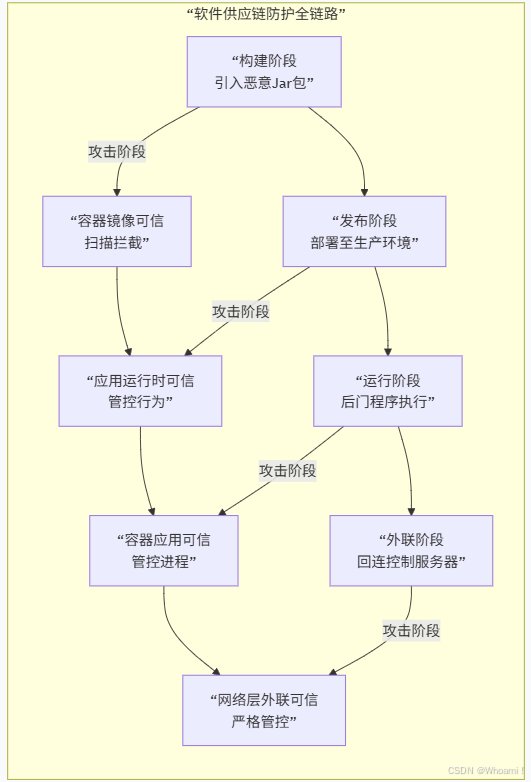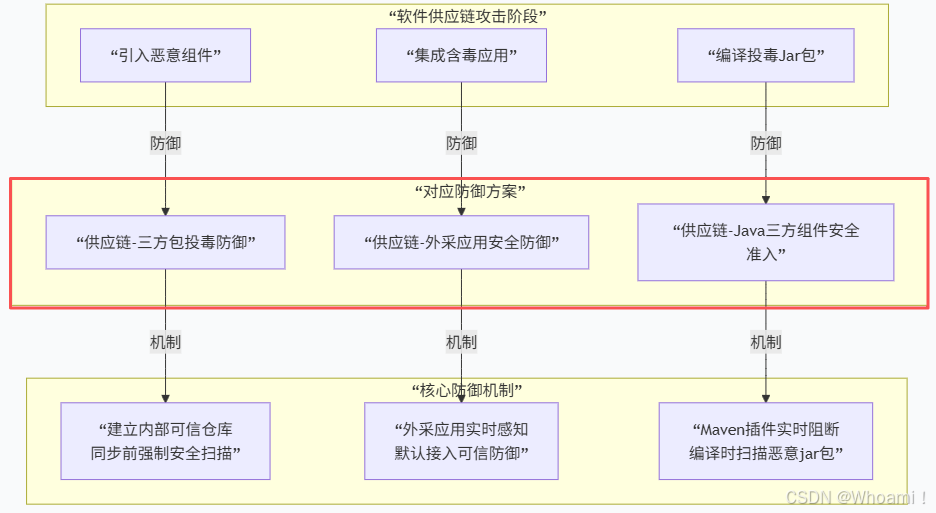为应对软件供应链各环节的威胁,需建立覆盖 "引入、构建、运行" 全生命周期的纵深防御体系,其核心防御框架与流程如下图所示: