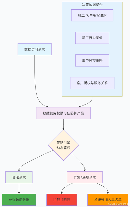 数据使用权限可信防护产品 :是一套动态查询鉴权服务 ,核心目标是在员工查询客户信息的场景下,基于++ABAC鉴权模型++ 实现精细化的实时访问控制。