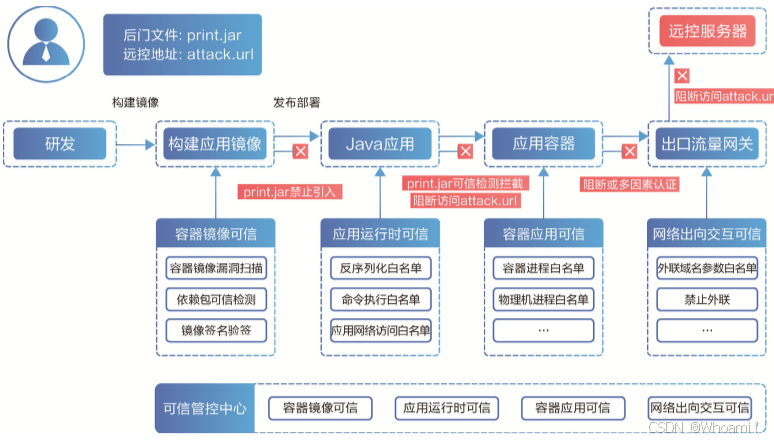 外联控守 :由于初始外联管控不严,后门程序成功回连攻击者的远程服务器,导致应用服务器被完全控制。