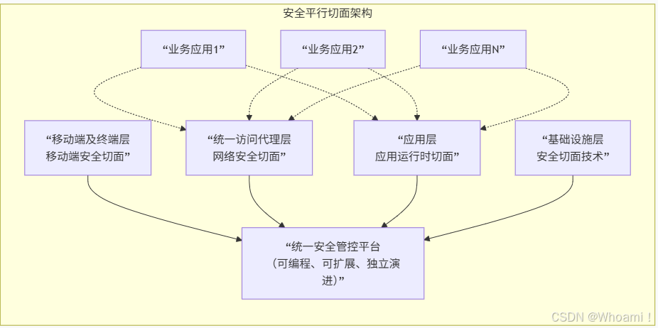 为实现安全与业务的解耦与融合 ,解决方案的核心是采用安全平行切面 技术来构建统一的可信策略控制点 。其总体架构如下图所示,它通过非侵入 的方式,在各个层级注入安全能力。