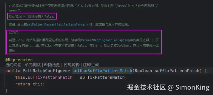 ,任何后缀后可以匹配。原因注释已经说明了:在将模式匹配到请求时是否使用后缀模式匹配 (".*")。如果启用,则映射到 "/users" 的方法也会匹配到 "/users.*"