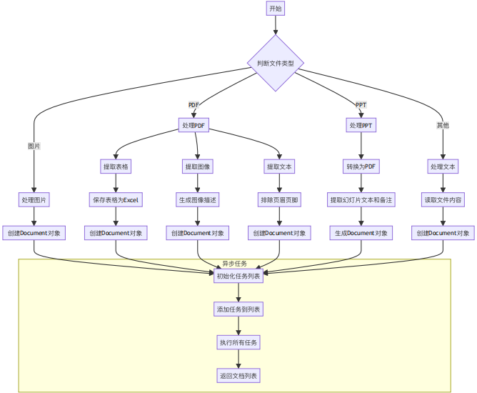 load_data收文件列表 → 判断类型 → 调用对应函数 → 异步执行 → 返回Documents。流程图: