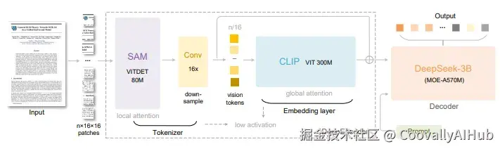 DeepEncoder采用创新的"先局部、再压缩、后全局"的三段式设计: