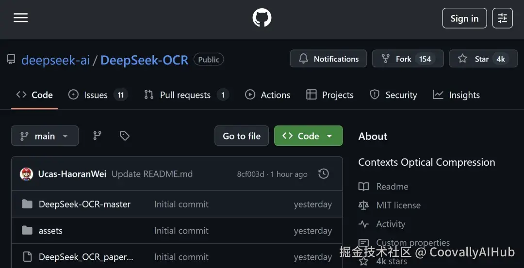 GitHub上的火爆程度印证了这一突破的重要性------DeepSeek-OCR项目一晚上就斩获超过4000个Star,成为近期最受关注的开源项目之一。