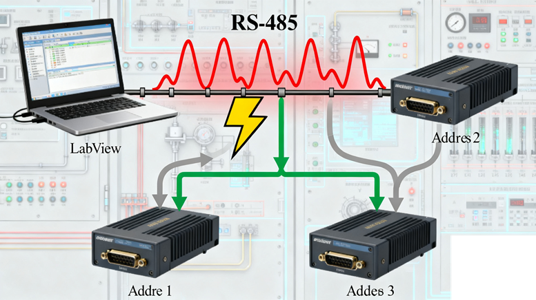 RS-485 通讯总线凭借抗干扰能力强、传输距离远等优势,广泛应用于工业控制领域。其采用半双工通讯模式,通过差分信号传输数据,支持多主从设备的总线型拓扑结构。但在实际应用中,常出现多台不同厂家 485 设备(如地址分别设为 1、2、3 的设备)单独运行时通讯正常,联合工作时 LabView 主机出现通讯超时、数据丢包、误码等异常现象,这一问题的核心在于总线电气特性匹配性与设备协议兼容性的双重冲突,需从底层原理到实际应用场景全面拆解。