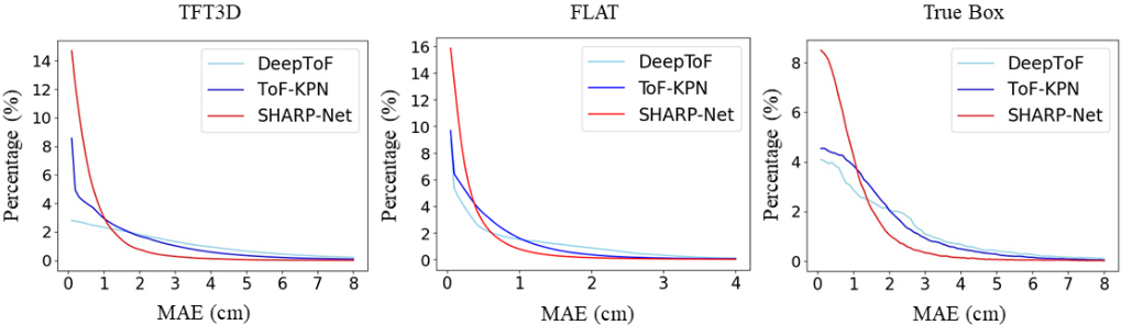 图4所示。不同方法在TFT3D、FLAT和True Box数据集上的逐像素误差分布曲线。这三种方法的分布曲线表明,我们提出的SHARP-Net在所有数据集上都获得了最优误差分布。