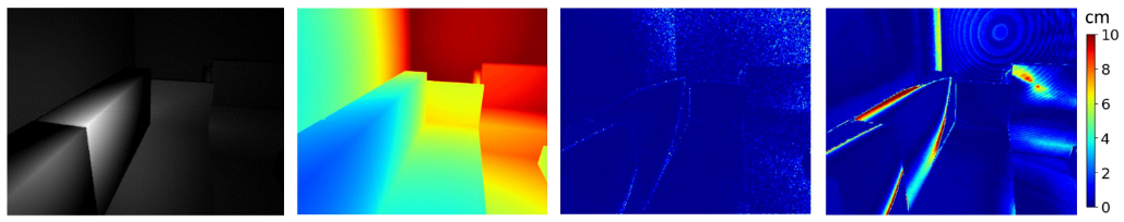 图1所示。(a)ToF振幅图像。(b) ToF 地面实况深度。(c) 散粒噪声引起的深度误差图。(d) MPI 引起的深度误差图。该示例来自合成数据集