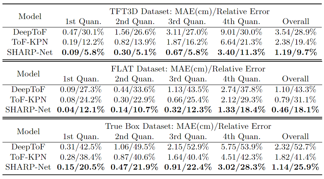 为了评估我们提出的SHARP-Net的性能,我们将其与两种最先进的ToF深度去噪方法DeepToF[17]和ToF-KPN[23]进行了比较。所有选定方法的输入是深度图像和相应的振幅图像的串联。需要注意的是,原始 DeepToF 在模型大小方面小于 SHARP-Net。为了公平比较,我们采用与 [23] 相同的策略将原始 DeepToF 模型替换为 ToF-KPN 的 U-Net 主干。TFT3D和FLAT数据集的定量实验结果如表2所示。可以看出,SHARP-Net在两个合成数据集的所有误差水平下都达到了最低的MAE和相对误差。TFT3D 和 FLAT 数据集的输入深度和地面实况深度之间的 MAE 分别为 12.24 cm 和 2.54 cm。在这些数据集上训练后,SHARP-Net 在测试集上将 MAE 分别降低了 1.19 cm 和 0.46 cm。相对误差也是衡量不同方法的性能的一个很好的指标。