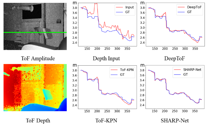 图6所示。与TFT3D数据集中深度图像中绿色扫描线的先前工作进行定量比较。'GT' 表示地面实况深度。我们提出的SHARP-Net在深度去噪方面表现出了最好的性能