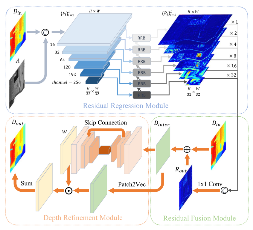 我们提出的空间层次感知残差金字塔网络(SHARPNet)由三部分组成:残差回归模块作为多尺度特征提取的骨干、残差融合模块和深度细化模块来优化性能。SHARP-Net的流程图如图2所示。以下小节分别解释这三个部分。