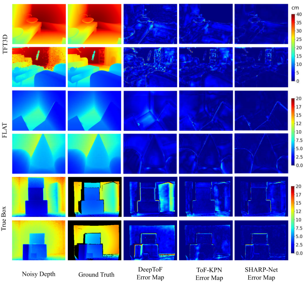 图5所示。TFT3D数据集、FLAT数据集和True Box数据集进行ToF深度去噪的定性比较。对于每个数据集,选择两个场景进行比较。右边的颜色条显示了单位在cm处的误差图的颜色刻度。