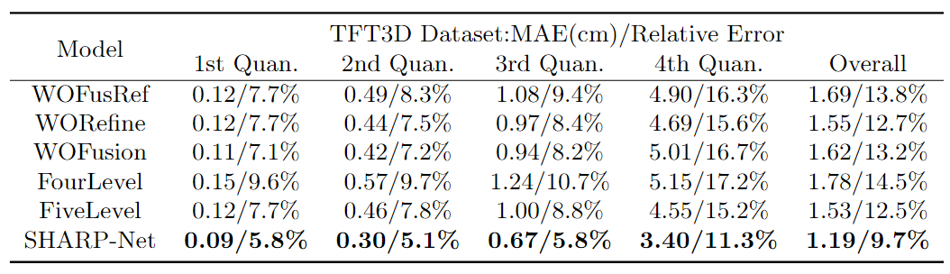 表1。与TFT3D数据集上SHARP-Net变体的定量比较。