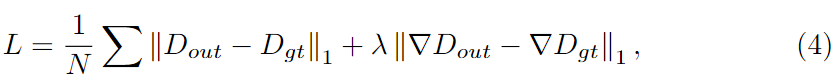 为了训练我们提出的SHARP-Net中的参数,我们需要计算预测深度图像Dout与相应地面真实深度图像Dgt之间的差异。损失函数应该引导我们的网络在保持几何细节的同时准确地去除深度噪声。在[23]之后,我们的损失函数有两个分量,分别是L1损失和它在精化深度图像上的梯度。损失函数的公式描述为