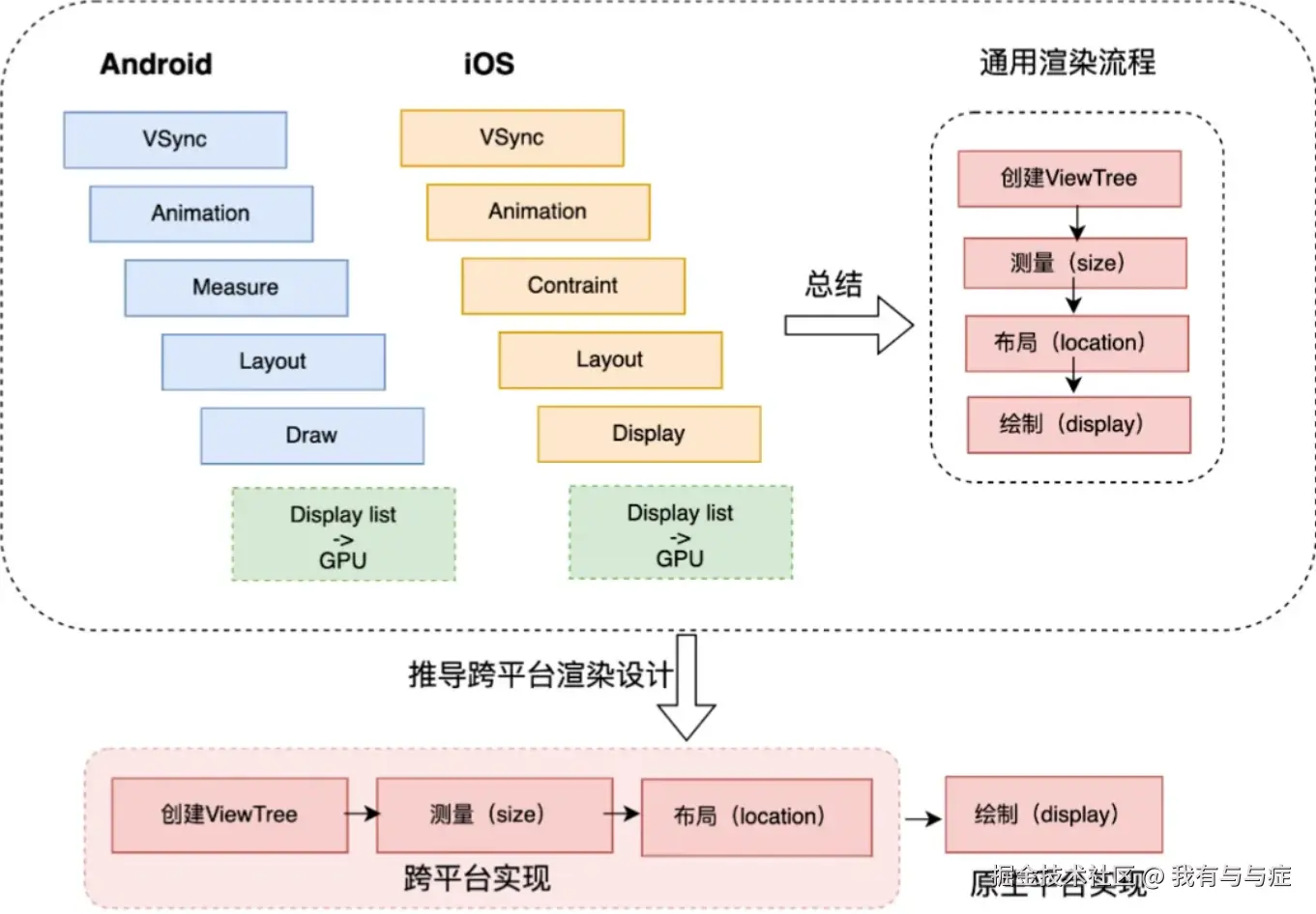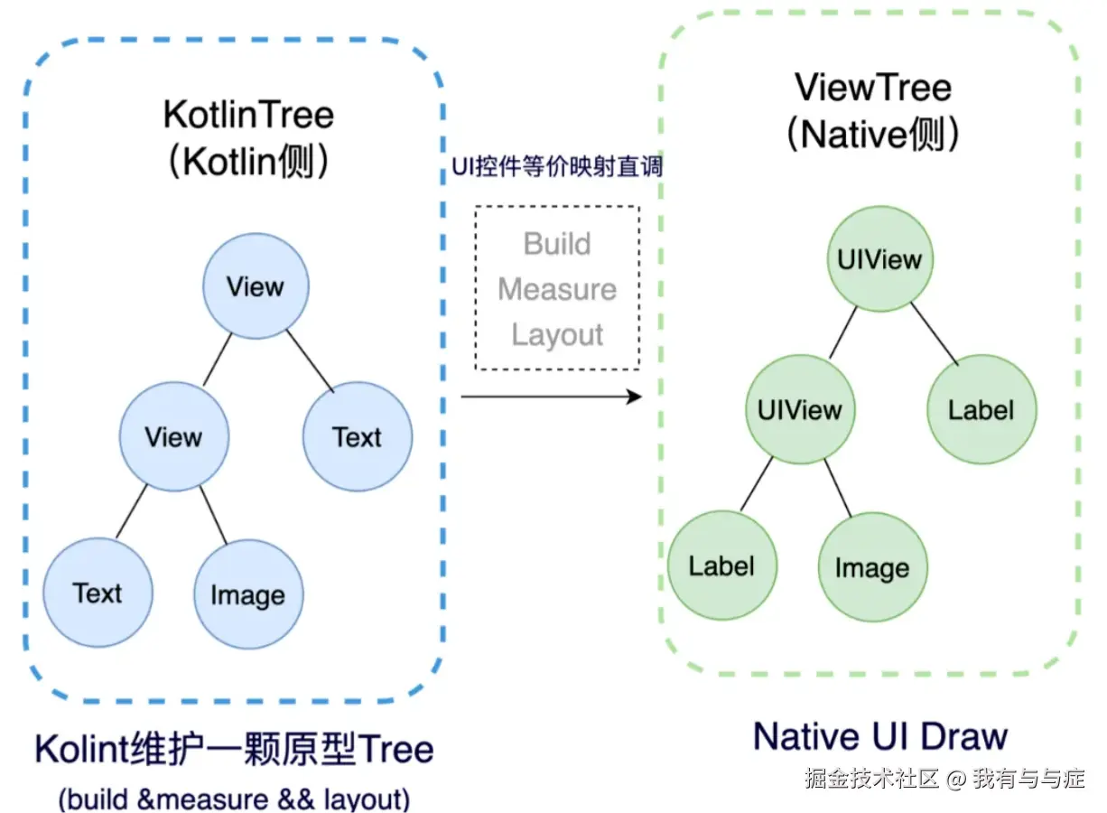 典型的渲染流程包括4个步骤:创建 ViewTree、测量、布局、绘制。为了保留纯原生渲染的体验,绘制这一步是放到了 Native 层,前三步都放在平台无关的 Kotlin 层。