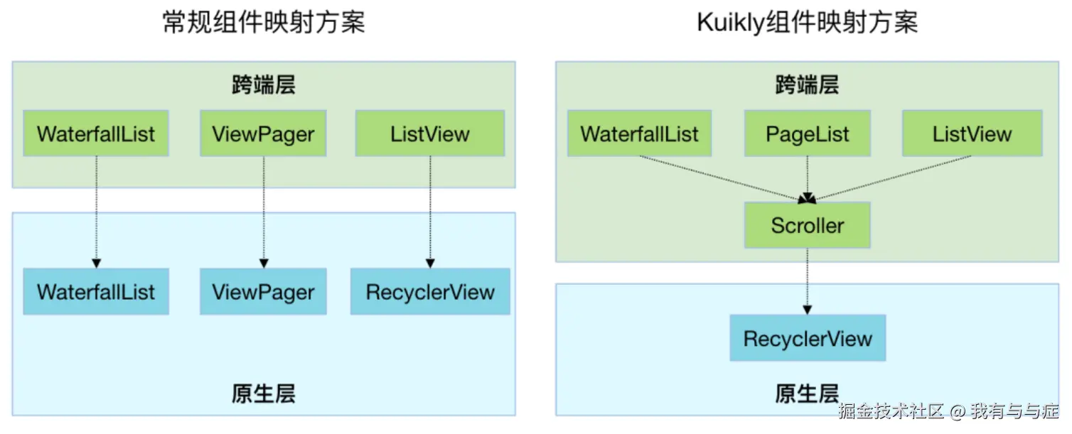 对比另外一个流行的跨端框架React Native ,RN核心思想是用 JavaScript 编写应用逻辑和 UI 结构,通过桥接机制调用原生组件,在 iOS 和 Android 上渲染原生 UI 。RN编译出来的最终产物并不是平台原生构建产物,而是依赖JavaScript运行时与原生平台通信,JS 和原生之间的通信需要序列化和反序列化,出现频繁通信场景时(如高频动画、复杂交互),会明显产生性能瓶颈。Kuikly的编译产物实际上和原生平台构建生成的产物没有区别,所以Kuikly可以有像原生开发般的性能。 RN 则是在运行时转换为原生控件,这种运行时转换肯定就不如Kuikly的原生编译产物性能好了。