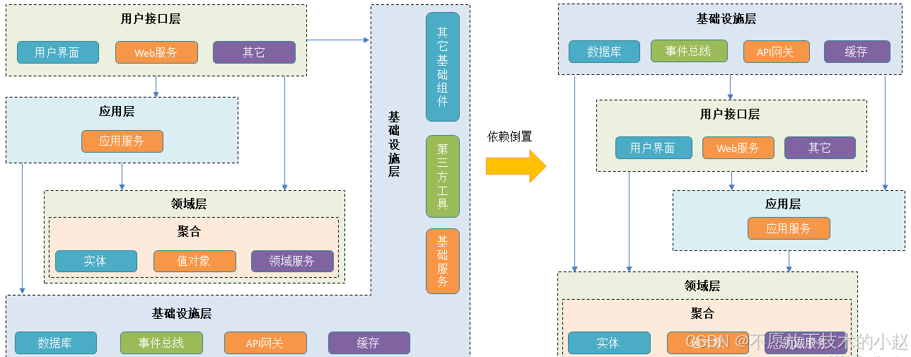 - 基础设施层:负责提供一些通用服务和功能,例如数据存储、消息传递、日志记录等。基础设施层通常包含一些工具类、库和框架等。