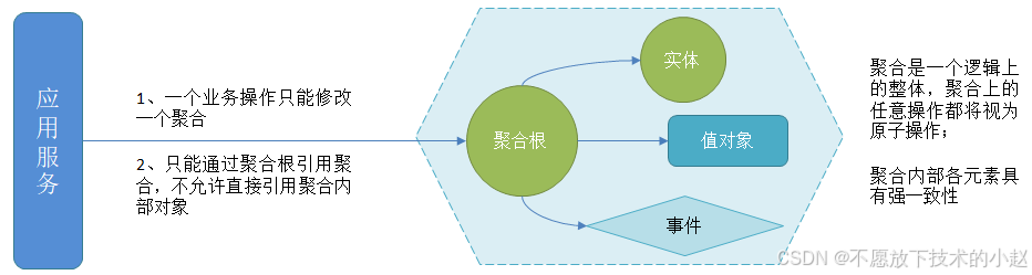 - 保持一致性:聚合内数据强一致,而聚合之间数据最终一致性。聚合中的实体和值对象在业务规则和约束下保持一致。如果一个聚合违反了业务规则或约束,那么它就不是一个一致的聚合。