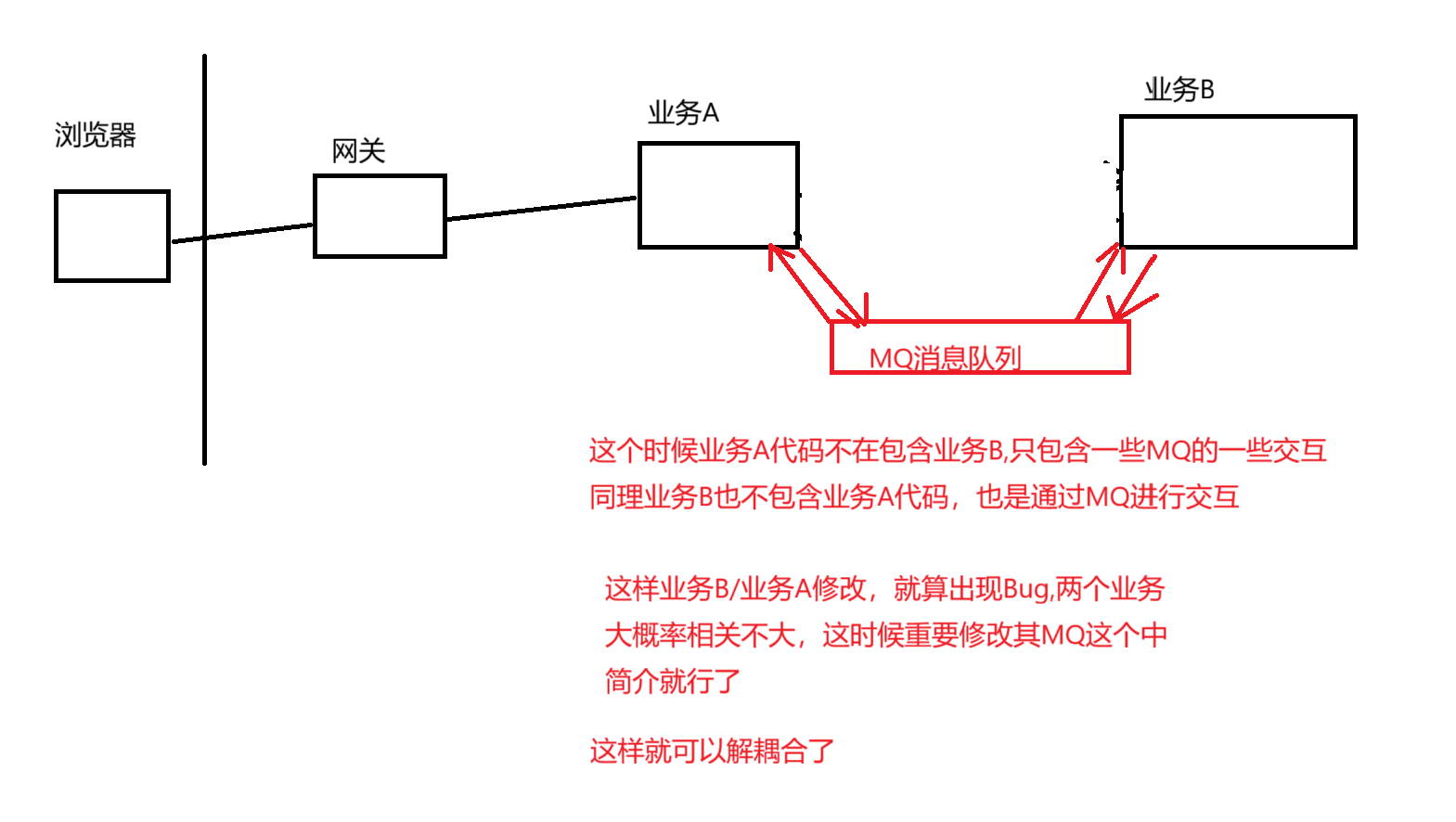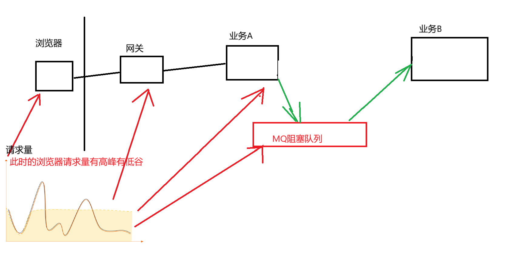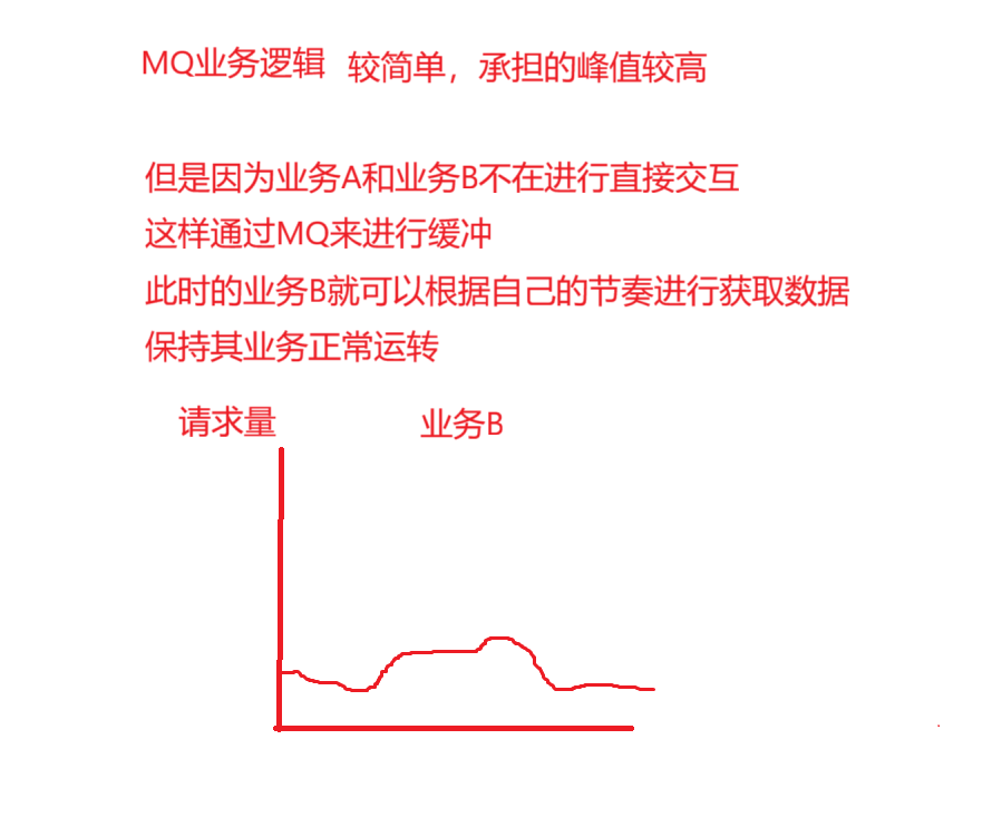 有了MQ阻断队列进行缓存 ,业务B可以根据自己节奏来获取数据,这样业务就可以正常运行,并且MQ阻塞队列能承受的峰值还是很大的