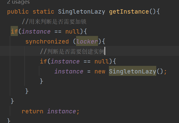 3.内外两层if判断instance 是否为空,外层是判断是否需要加锁,内层是判断是否要初始化