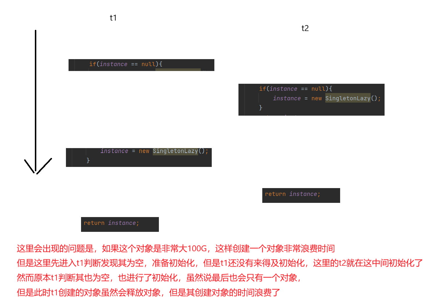 但是这个和饿汉不同,这里会在这个getInstace方法中初始化,在多线程下可能会这样就可能会出现线程安全问题,所以其是线程不安全的