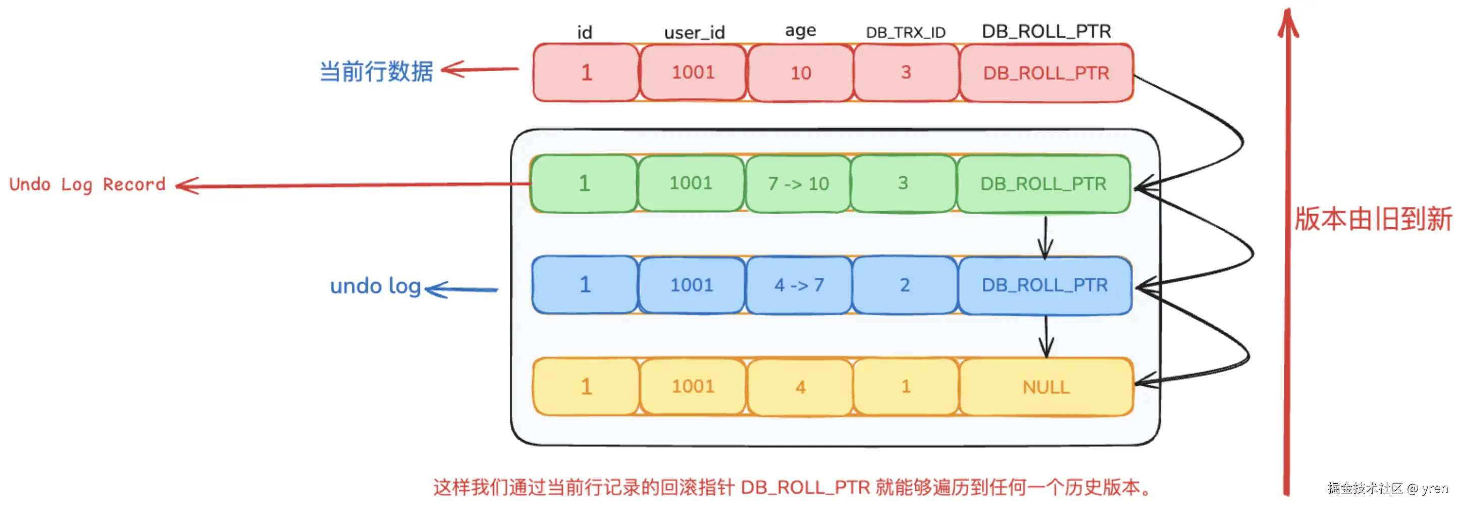 :是 InnoDB 每行中的 7 字节隐藏字段,称为 回滚指针它指向当前行数据的上一个版本,用它来找到上一个事务更新后产生的历史版本数据