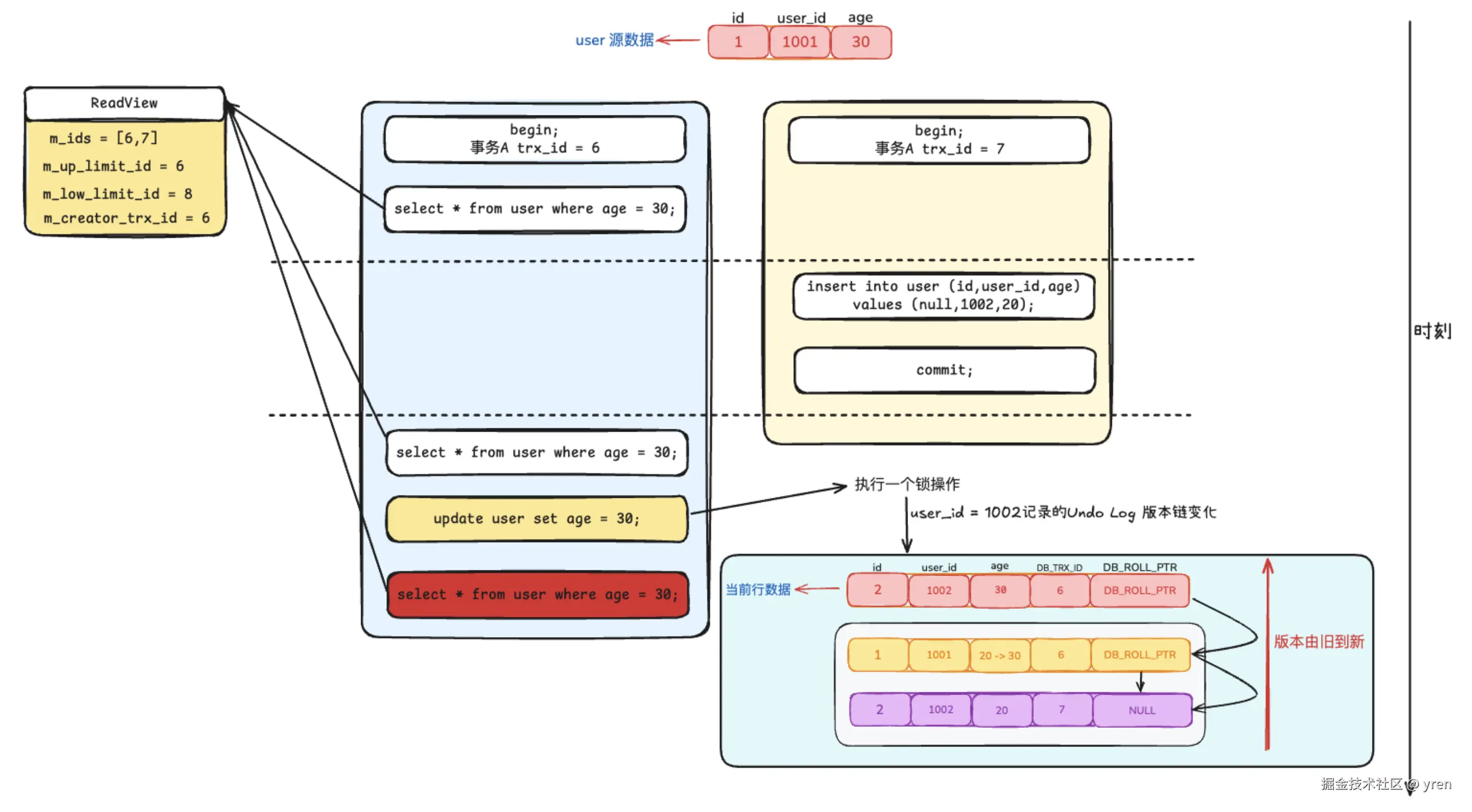 - 继续通过 DB_ROLL_PTR 回溯到第二条记录(age=30, DB_TRX_ID=3)发现 DB_TRX_ID=3 也在活跃事务列表中,该版本不可见