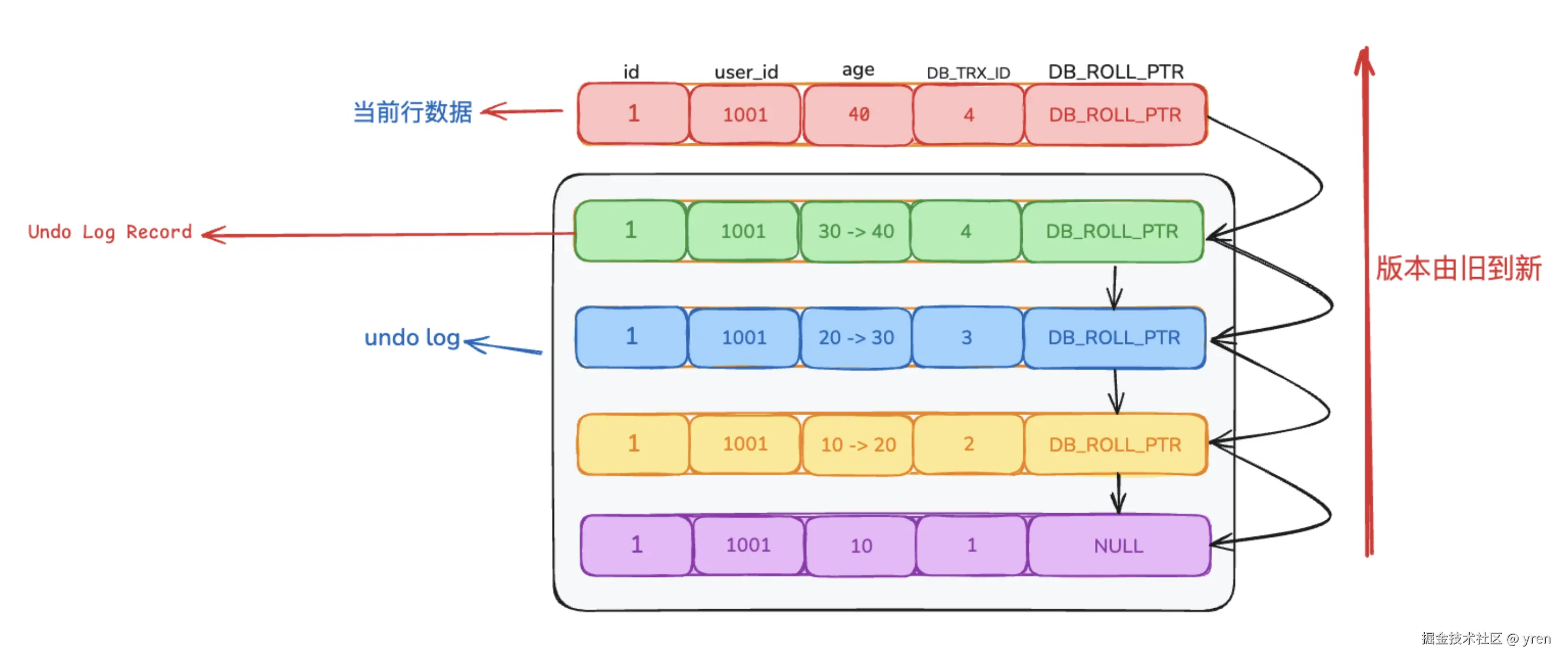****是一个多版本存储引擎。它会保存被修改行的旧版本信息,用来支持事务的并发控制和回滚等特性。存储在 undo log 中,为了让多个历史版本建立引用关系以及让版本和事务绑定,行记录内部添加了以下字段。