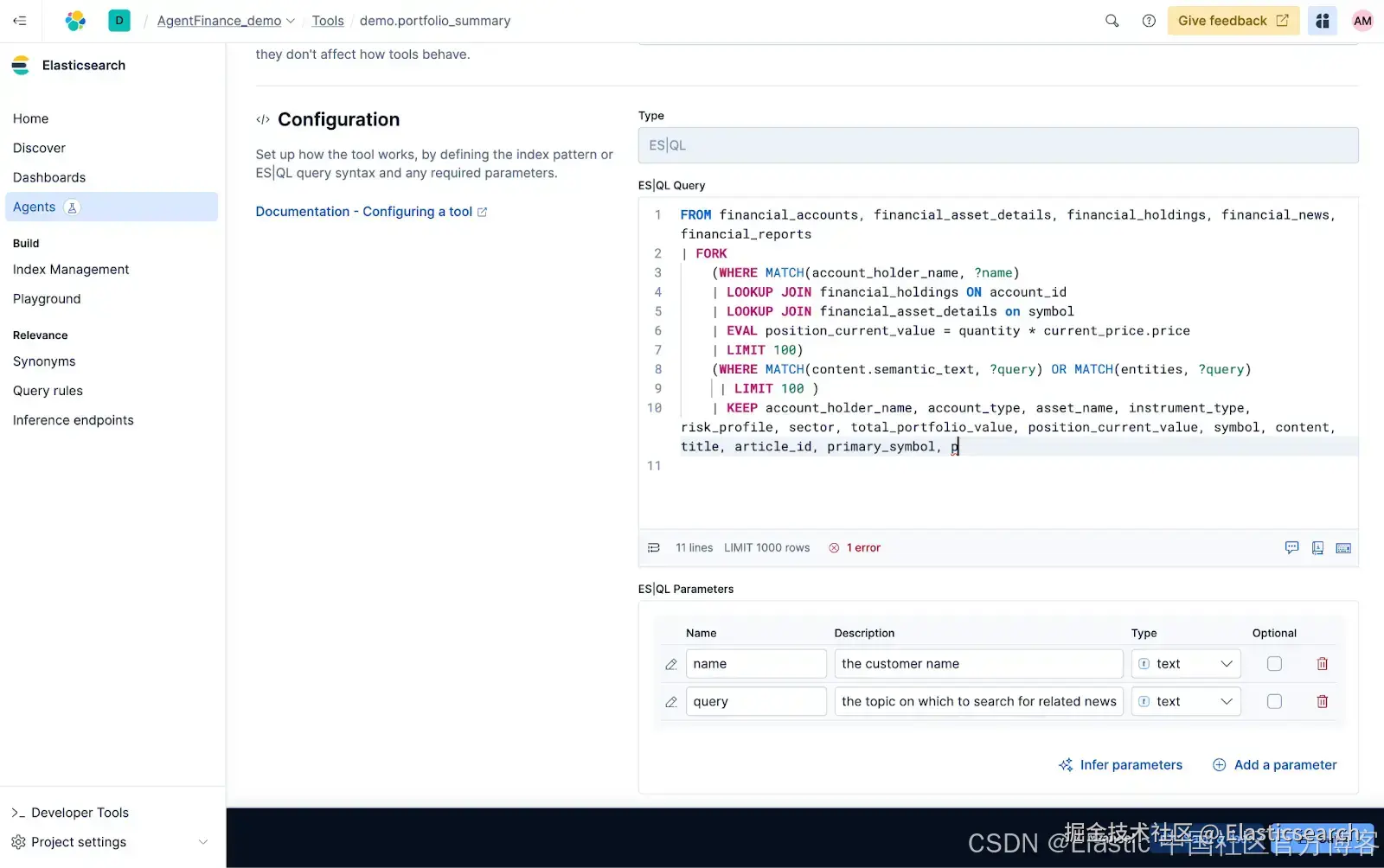 - 构建自定义工具:创建你自己的自定义工具,为代理赋予新技能,充分利用 Elasticsearch 的查询语言(ES|QL),精确控制用于上下文的数据。这让你能细粒度地控制代理响应的相关性、准确性和安全性。