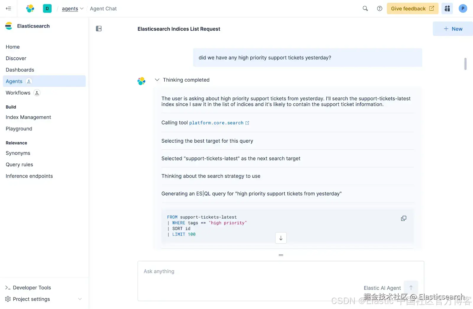 - 立即与数据对话:Agent Builder 包含一个内置的原生对话代理。开箱即用,你就可以向 Elasticsearch 中的任何数据提问并交互,让你的数据成为一个主动的对话伙伴。