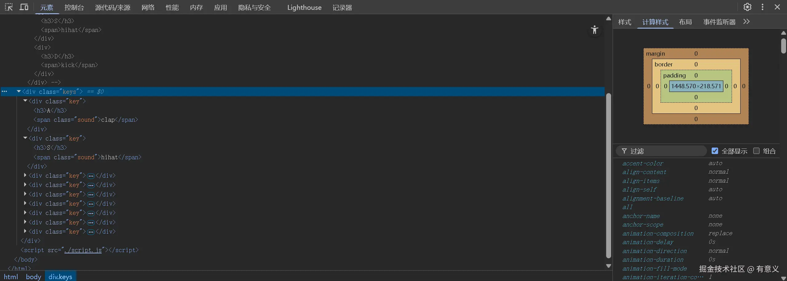接下来就是keys的计算 上面可以看到,一个key的高度为24.286 我们有9个div在一起,所以div keys的高度为24.286*9=218.571 这个是简易计算,其实是先算大的部分,浏览器再计算小的部分,最后渲染上去。