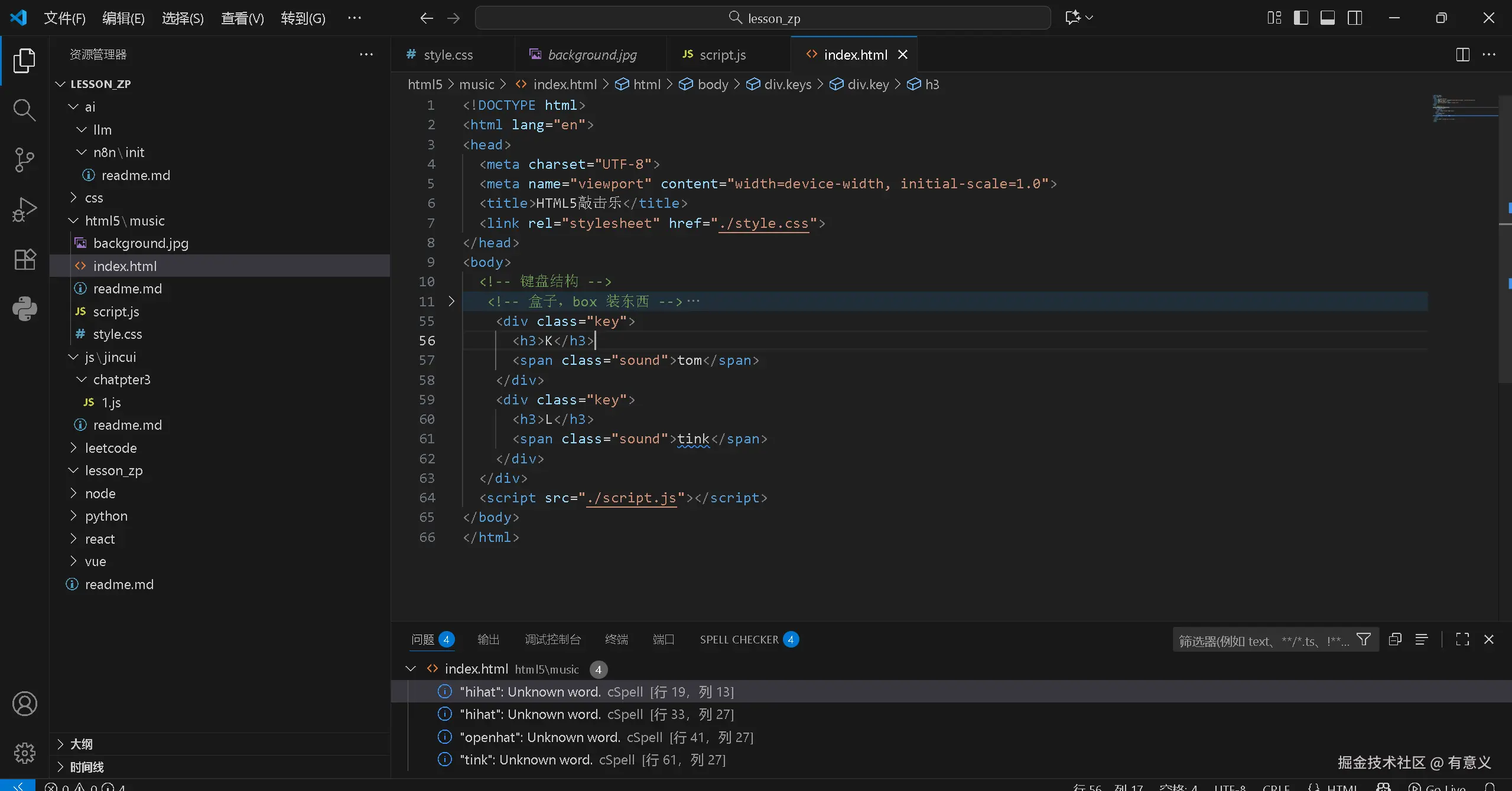 对于敲击乐,我们通常会用 div 元素创建黑白琴键的容器,用 span 元素标记每个琴键对应的音名或键盘按键,这种 "先结构后样式" 的开发理念,能确保代码的逻辑性和可维护性。