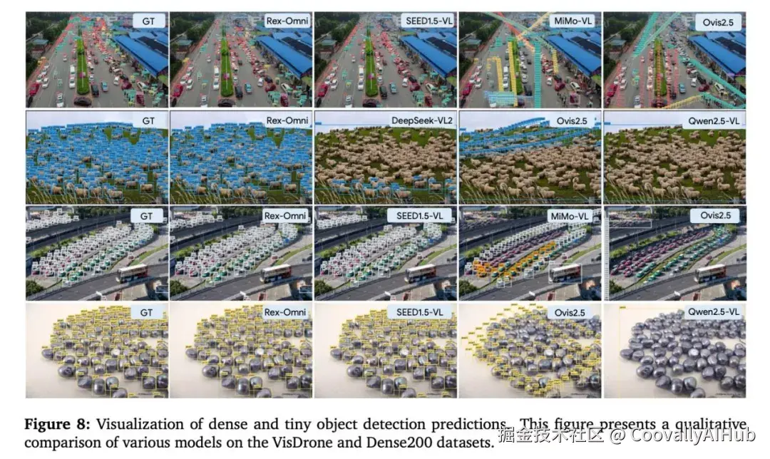 密集小目标检测: 在Dense200数据集上取得78.4的F1@0.5分数,有效解决了MLLM在密集小目标上的传统弱点。