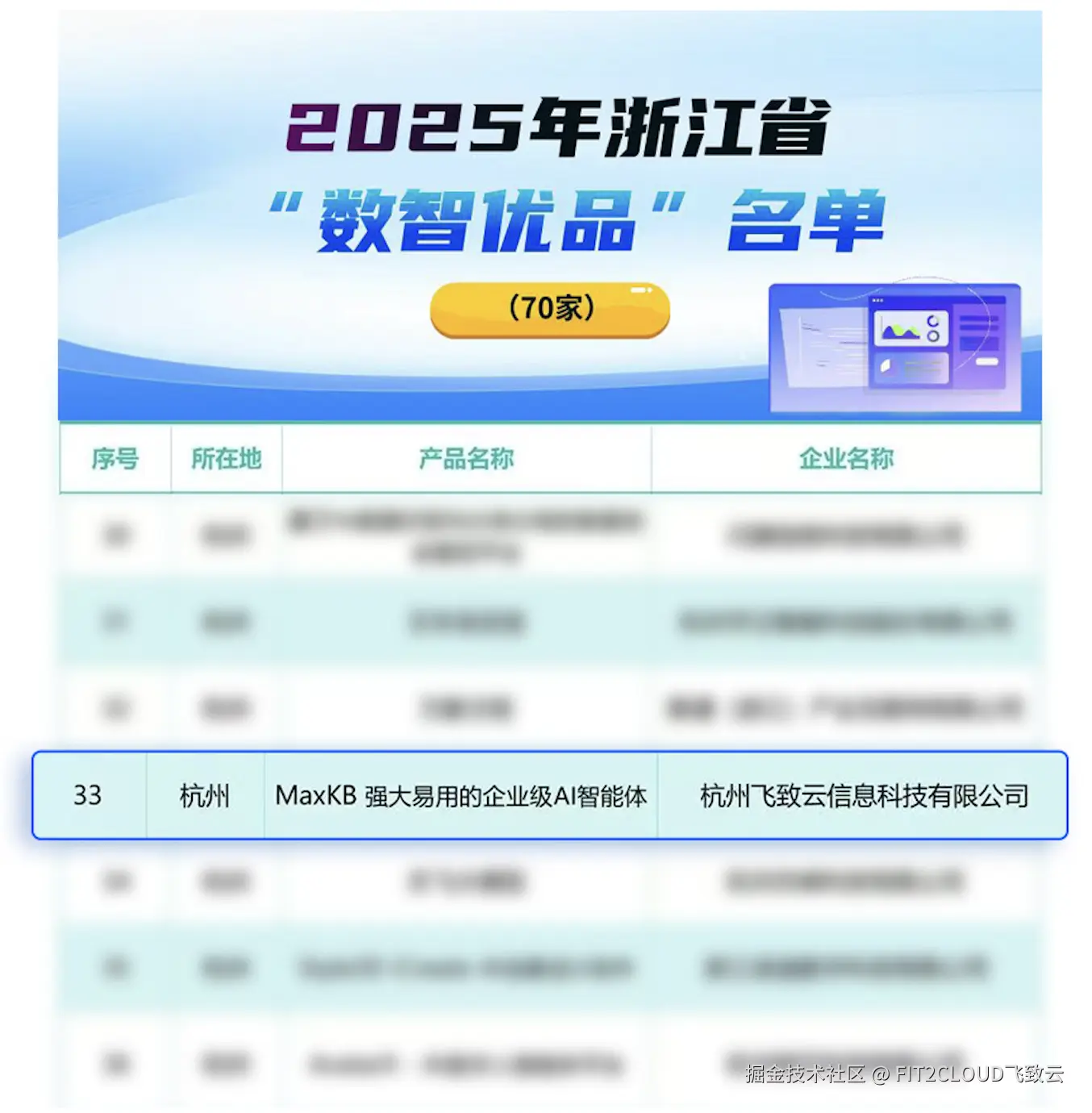 2025年10月11日,浙江省经济和信息化厅公布了2025年浙江省"数智优品"名单,飞致云旗下MaxKB开源企业级智能体平台成功入选。此项评选旨在贯彻落实国务院深入实施"人工智能+"行动的战略部署,全面推进人工智能赋能新型工业化,加快推动人工智能创新应用,赋能产业深度转型。其评选过程经历了单位自主申报、地市推荐、专家评审等程序。