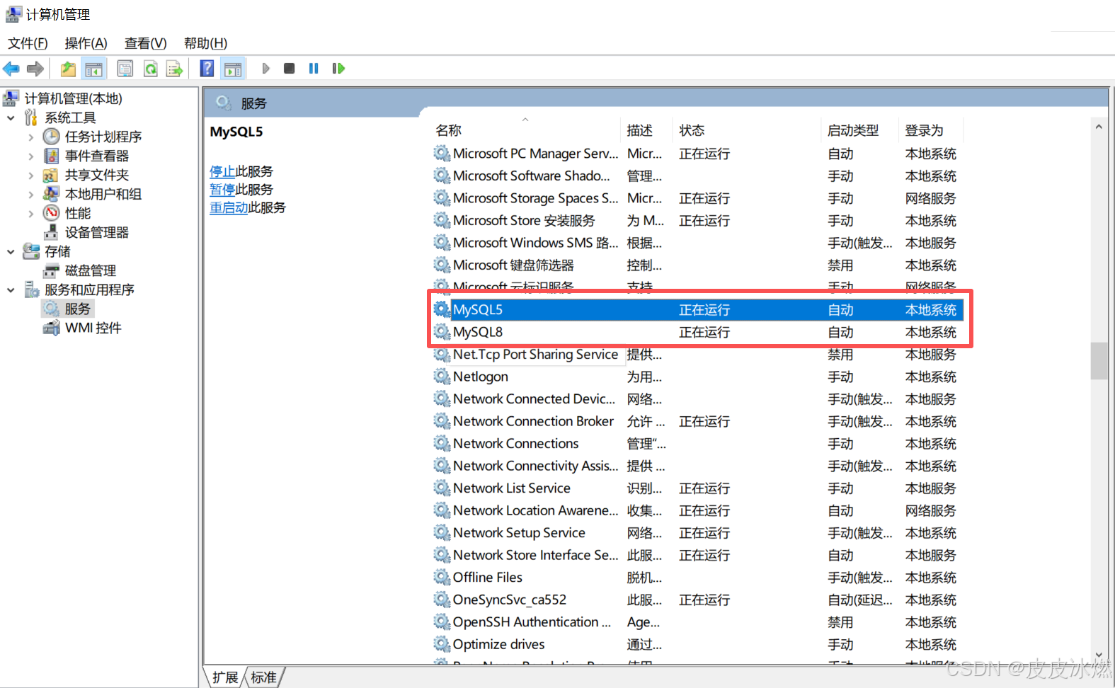 右键此电脑->管理->服务和应用程序->服务,然后就可以找到安装的MySQL5和MySQL8两个服务,根据需要启动其中一个或者同时启动多个服务。
