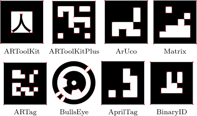上图展示了不同类型的AR标记物设计,包括ARToolKit、ARToolKitPlus、ArUco、Matrix、ARTag、BullsEye、AprilTag和BinaryID。这些标记物通过其独特的视觉模式,在AR系统中发挥着至关重要的作用,使系统能够检测、跟踪和理解现实世界物体或表面的位置和方向。